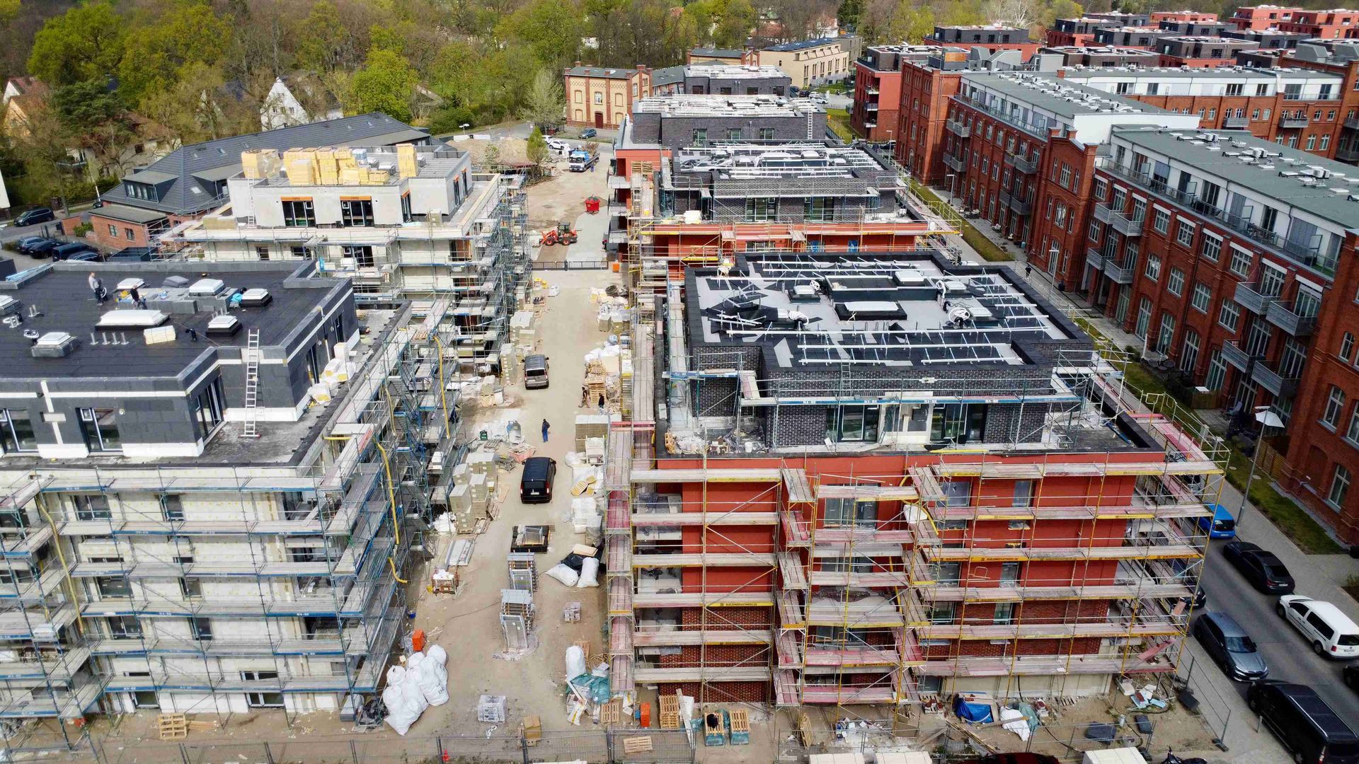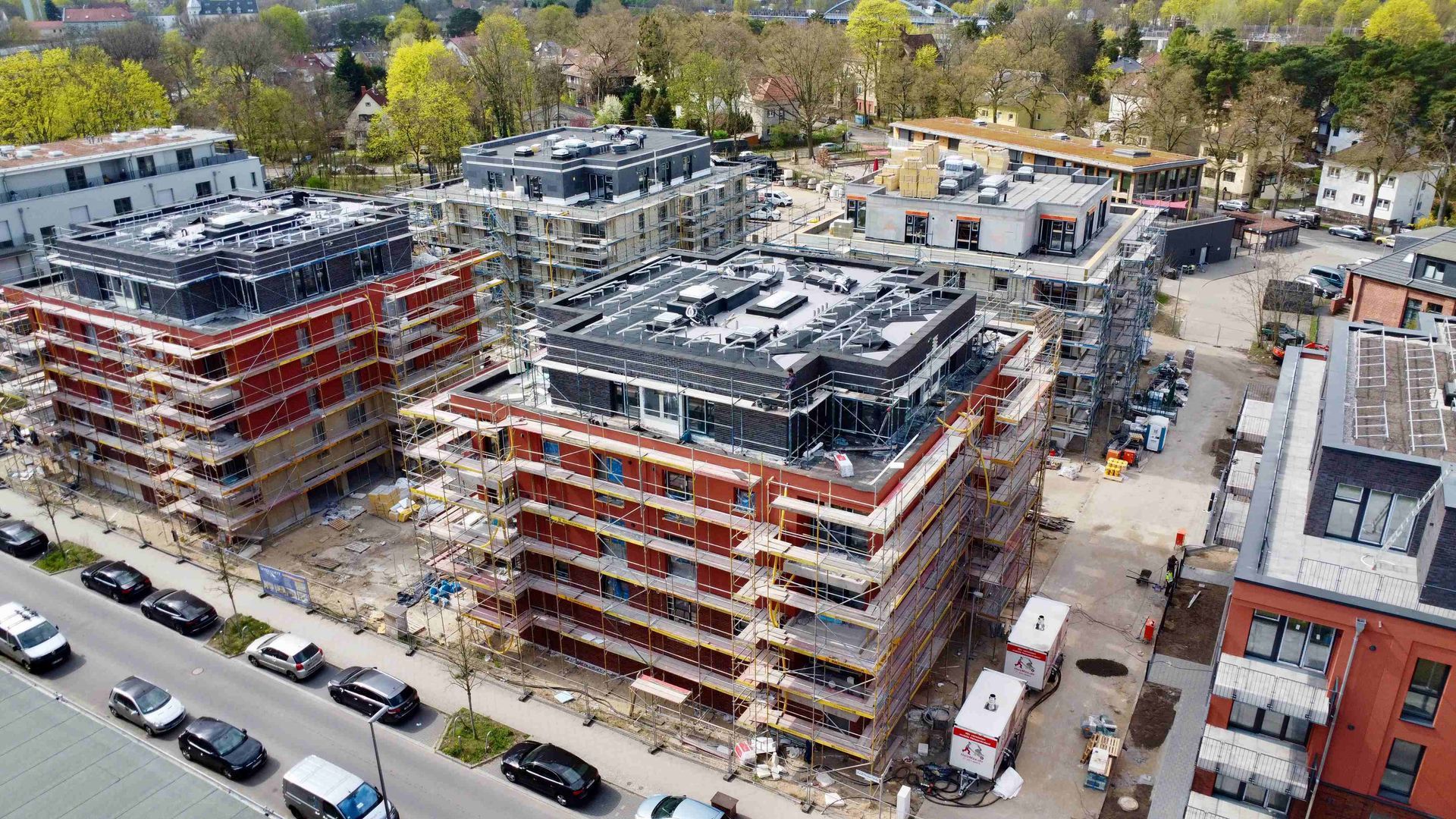 Der Bauabschnitt "Gardenside" ist fertiggestellt! Acht Familien können sich auf den Einzug in ihre neuen Eigenheime freuen. Die Reihenhausanlage umfasst sieben aneinandergebaute und ein freistehendes Haus, die gemeinsam eine harmonische Wohnlandschaft in Spindlersfeld bilden. Auch bei den weiteren Projekten gibt es Fortschritte: In der "Parkside III" ist bereits die charakteristische rote Fassade sichtbar, die dem Gebäude ein lebendiges Erscheinungsbild verleiht. In der "Parkside IV" werden aktuell die letzten Stockwerke im Rohbau vollendet.