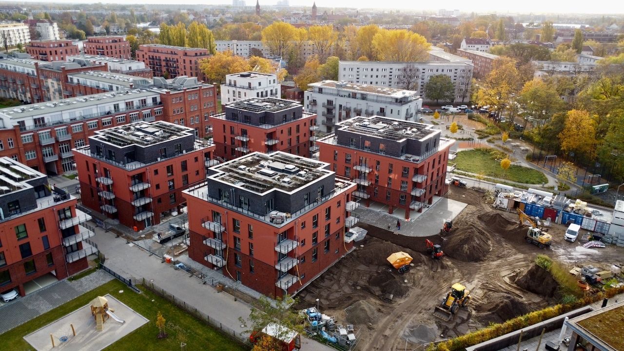 Im April hat sich auf unserer Baustelle im Spreequartier Spindlersfeld wieder einiges getan. Die Projekte Parkside III und IV entwickeln sich mit großen Schritten weiter – sowohl im Innen- als auch im Außenbereich. Bei Parkside III ist der Ausbau der Außenanlagen in vollem Gange. Die Zufahrten werden aktuell gepflastert. Außerdem entsteht derzeit der Kinderspielplatz – ein zentraler Bestandteil für das familienfreundliche Wohnumfeld im Quartier. Auch bei Parkside IV schreiten die Arbeiten sichtbar voran. In allen Gebäuden sind die Fenster eingebaut. Zwei der Gebäude erstrahlen bereits in ihrer finalen Fassade in markantem Rot.