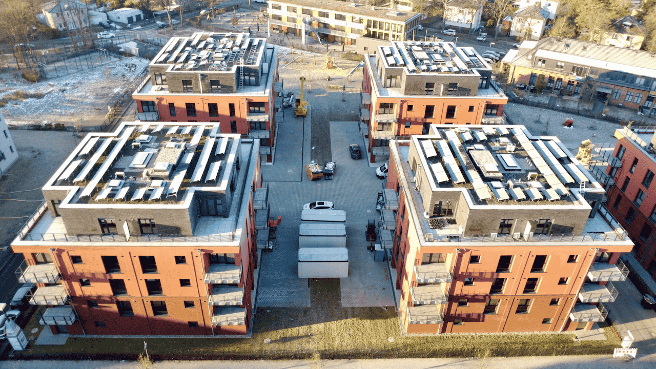 Der November zeigt sich von seiner sonnigen Seite und wirft warmes Licht auf die fortschreitenden Arbeiten im Spreequartier Spindlersfeld. Die Photovoltaik-Anlage auf dem Dachglänzt in der Herbstsonne und wird den späteren Nutzern nachhaltige Energie liefern. Im Außenbereich rund um Parkside IV geht es weiter zügig voran. Die Pflasterarbeiten für die Wege schreiten sichtbar voran. Gleichzeitig wird der neue Spielplatz errichtet. Auch die Natur hält Einzug: Der erste Rasen wächst bereits an und bringt frisches Grün in die Gestaltung der Freiflächen.