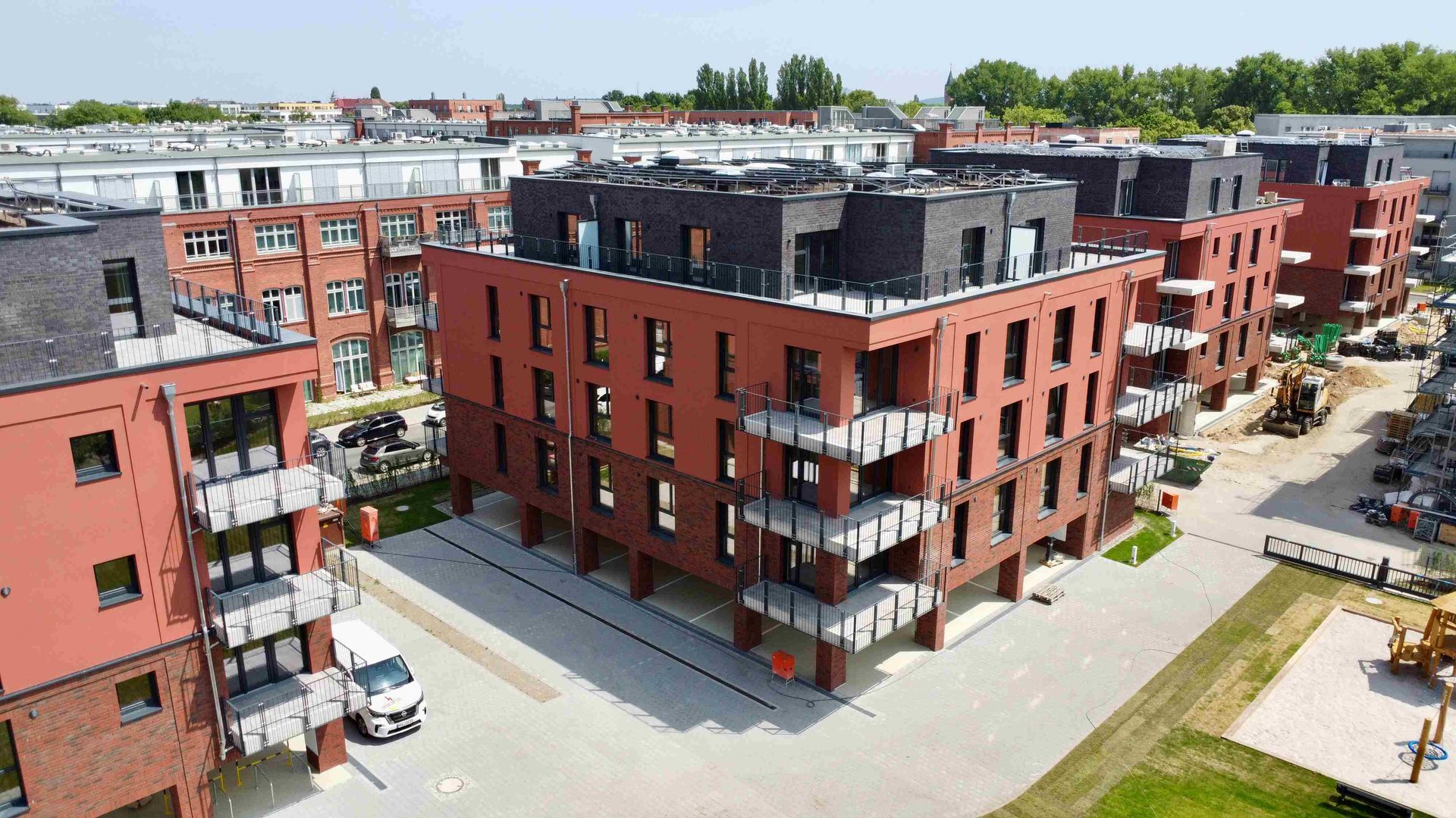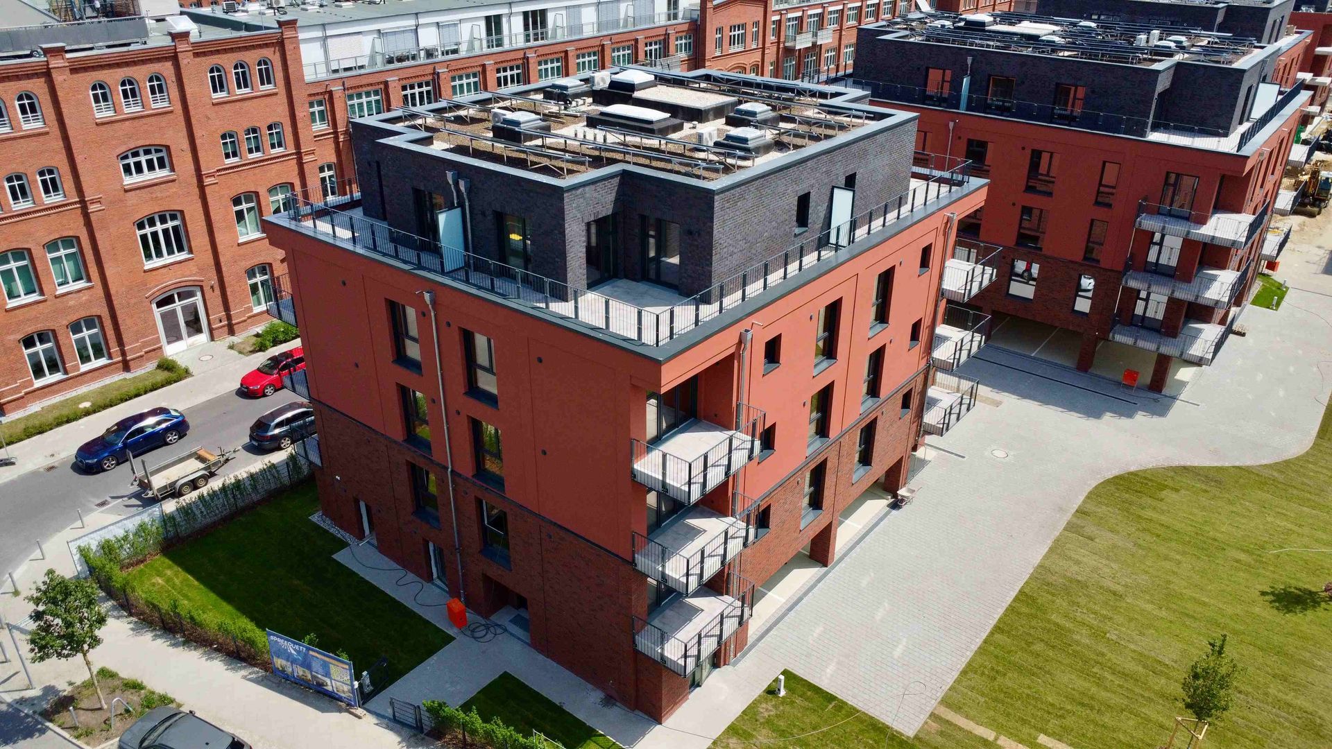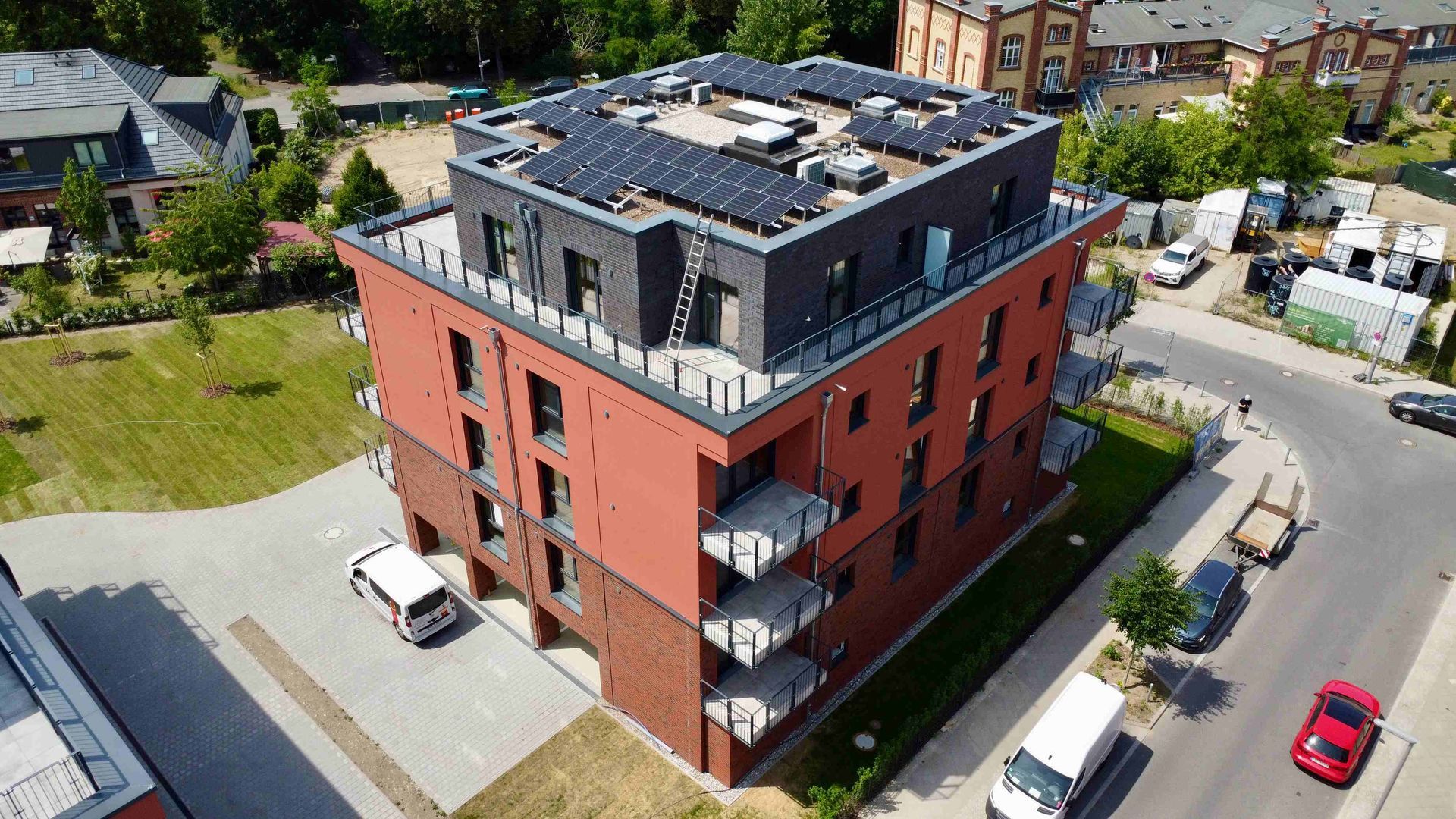 Parkside III ist vollständig fertiggestellt! Die Außenanlagen präsentieren sich in ihrer finalen Form – der Rasen bedeckt nun die Grünflächen, und sämtliche Bäume sind gepflanzt. Auch die Photovoltaik-Anlage wurde auf dem Dach installiert und leistet künftig einen Beitrag zur nachhaltigen Energieversorgung im Quartier. Noch in diesem Monat findet die Übergabe des Gemeinschaftseigentums an die neuen Eigentümer statt.