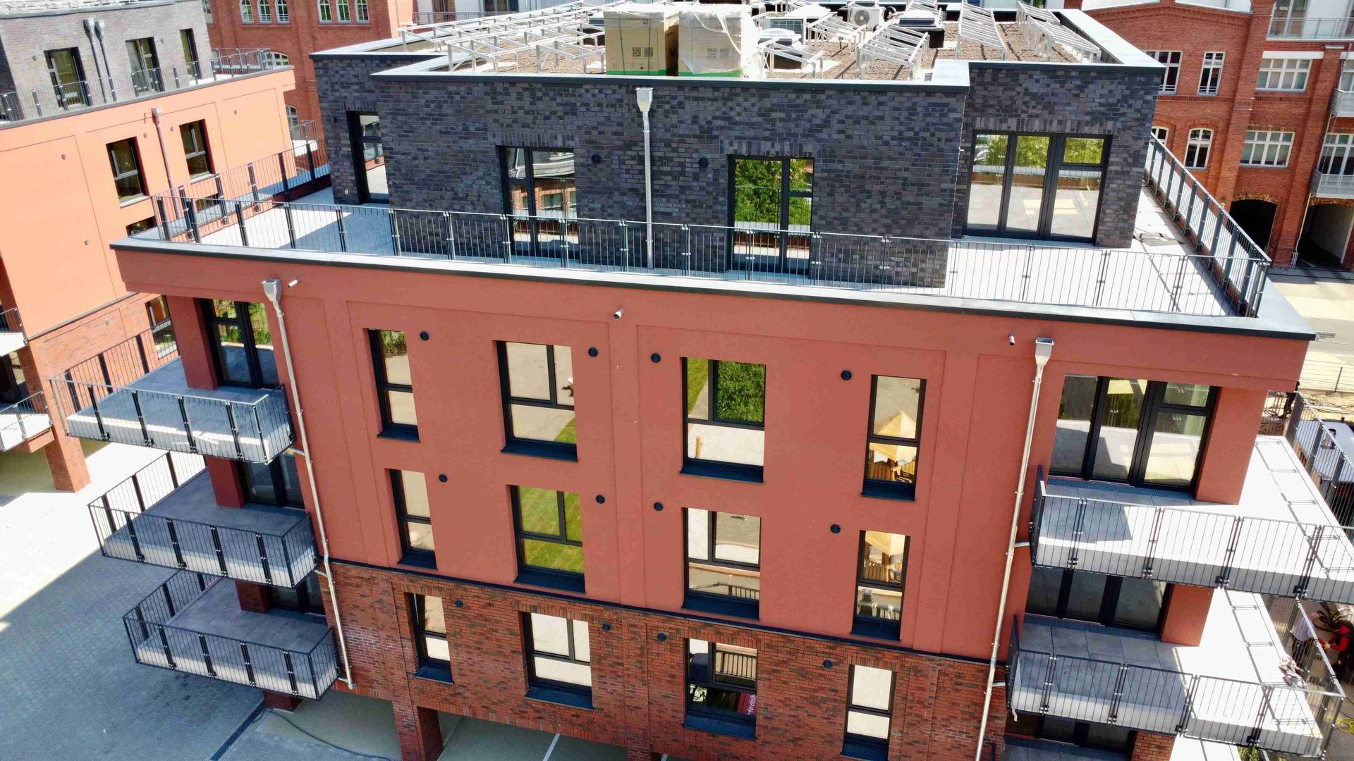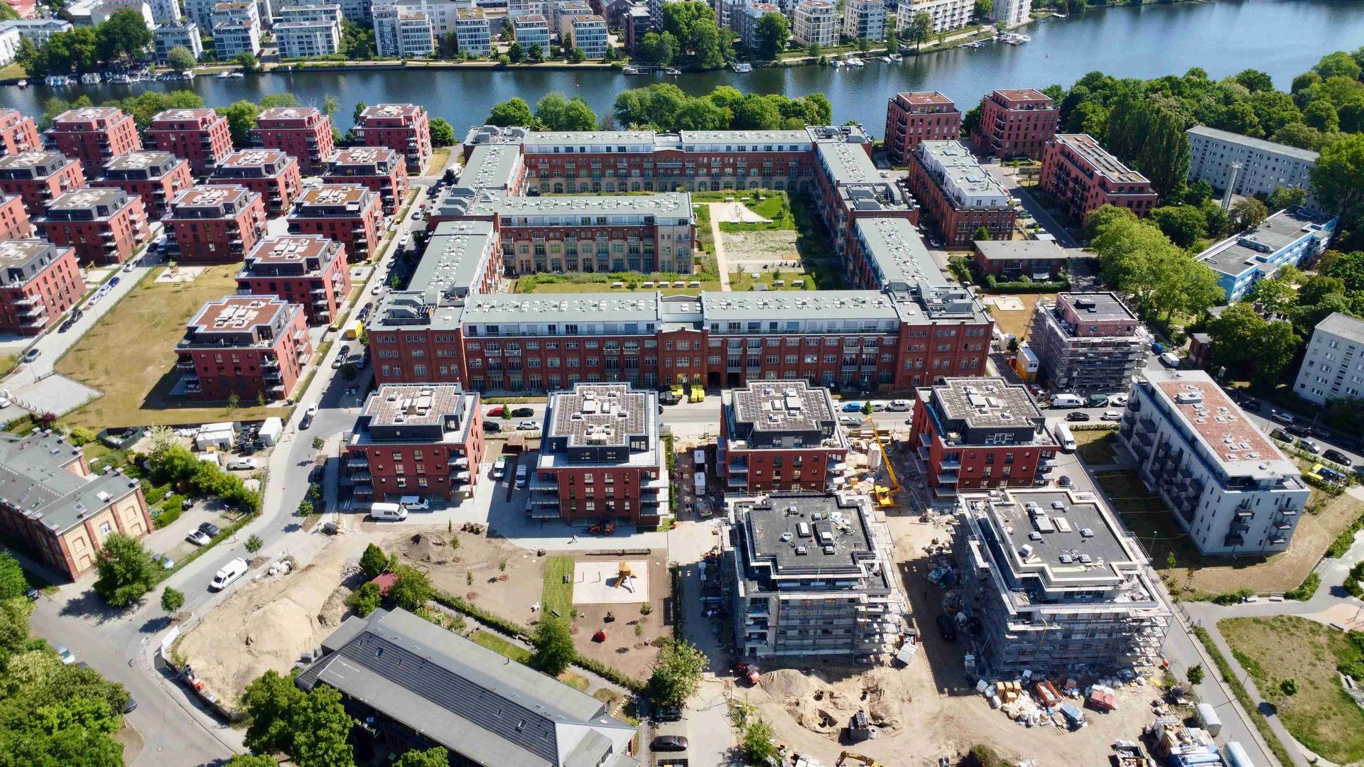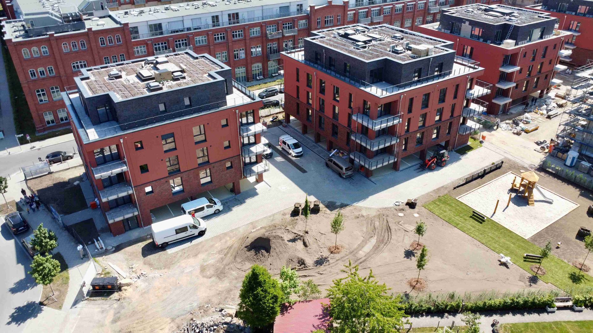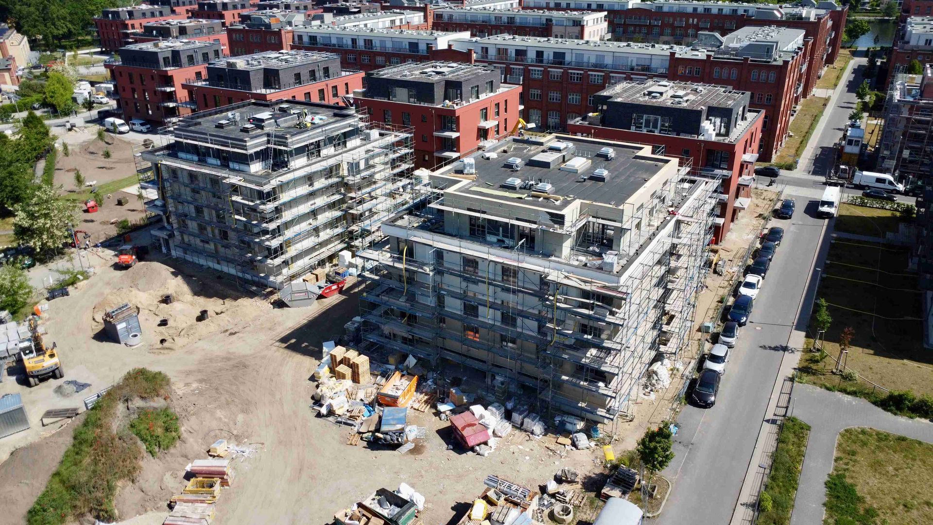 Im April hat sich auf unserer Baustelle im Spreequartier Spindlersfeld wieder einiges getan. Die Projekte Parkside III und IV entwickeln sich mit großen Schritten weiter – sowohl im Innen- als auch im Außenbereich. Bei Parkside III ist der Ausbau der Außenanlagen in vollem Gange. Die Zufahrten werden aktuell gepflastert. Außerdem entsteht derzeit der Kinderspielplatz – ein zentraler Bestandteil für das familienfreundliche Wohnumfeld im Quartier. Auch bei Parkside IV schreiten die Arbeiten sichtbar voran. In allen Gebäuden sind die Fenster eingebaut. Zwei der Gebäude erstrahlen bereits in ihrer finalen Fassade in markantem Rot.