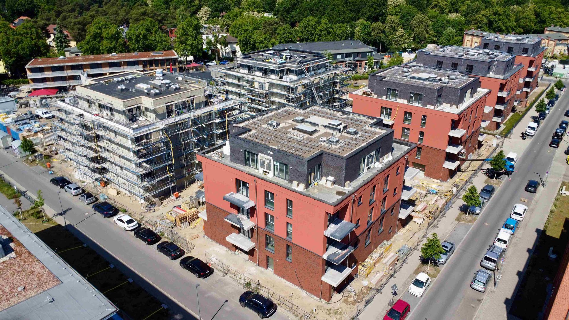 Der Bauabschnitt "Gardenside" ist fertiggestellt! Acht Familien können sich auf den Einzug in ihre neuen Eigenheime freuen. Die Reihenhausanlage umfasst sieben aneinandergebaute und ein freistehendes Haus, die gemeinsam eine harmonische Wohnlandschaft in Spindlersfeld bilden. Auch bei den weiteren Projekten gibt es Fortschritte: In der "Parkside III" ist bereits die charakteristische rote Fassade sichtbar, die dem Gebäude ein lebendiges Erscheinungsbild verleiht. In der "Parkside IV" werden aktuell die letzten Stockwerke im Rohbau vollendet.