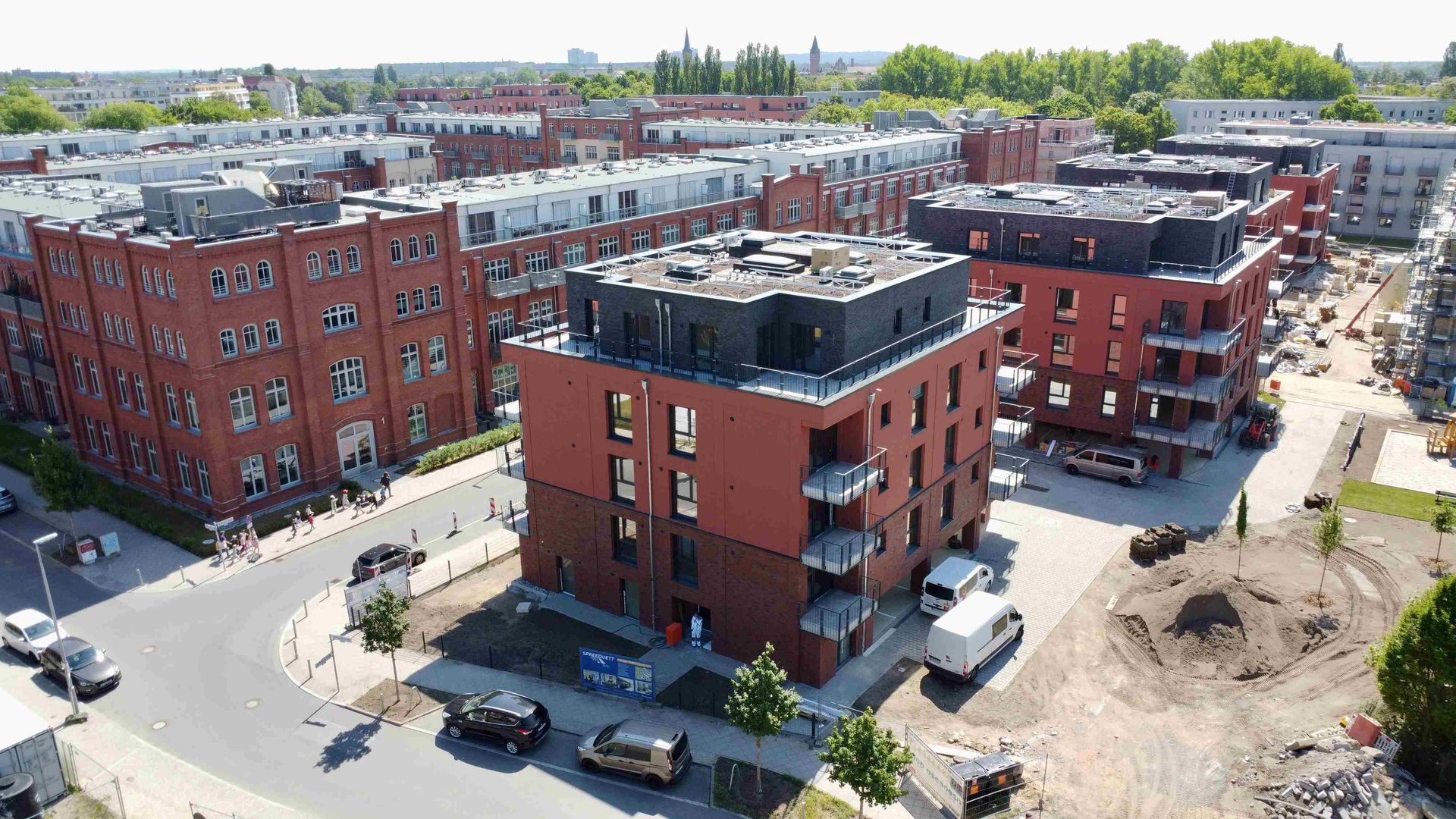 Die Sommermonate waren im Spreequartier Spindlersfeld geprägt von kontinuierlicher Bautätigkeit – und sichtbaren Ergebnissen. Die aktuellen Bilder zeigen eindrucksvoll, wie sich das Quartier weiterentwickelt. Ein wichtiger Meilenstein ist erreicht: Die Fassade des letzten Mehrfamilienhauses von Parkside IV wurde fertiggestellt. Damit präsentieren sich nun alle Tower in einem einheitlichen Erscheinungsbild mit der charakteristischen roten Klinkerfassade – ein architektonisches Highlight, das dem Quartier einen hochwertigen, stimmigen Gesamteindruck verleiht. Im Inneren schreiten die Ausbauarbeiten ebenfalls weiter voran. Elektrik, Heizung, Böden und Innenwände nehmen Form an, sodass auch die Wohnräume nach und nach Gestalt annehmen. Mit dem Bau der geplanten Gewerbeeinheit startet zugleich der letzte Bauabschnitt im Spreequartier. Die Bodenplatte wurde im August gegossen und bildet die Basis für ein kleines, vielseitig nutzbares Gebäude.