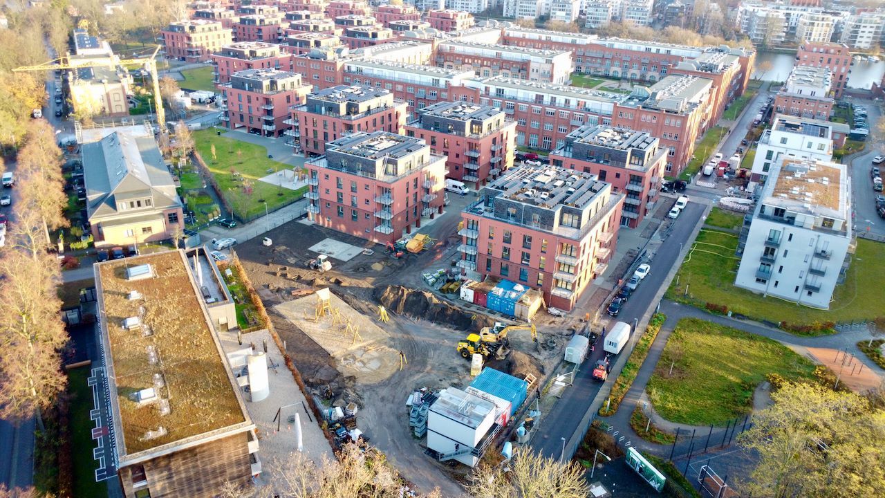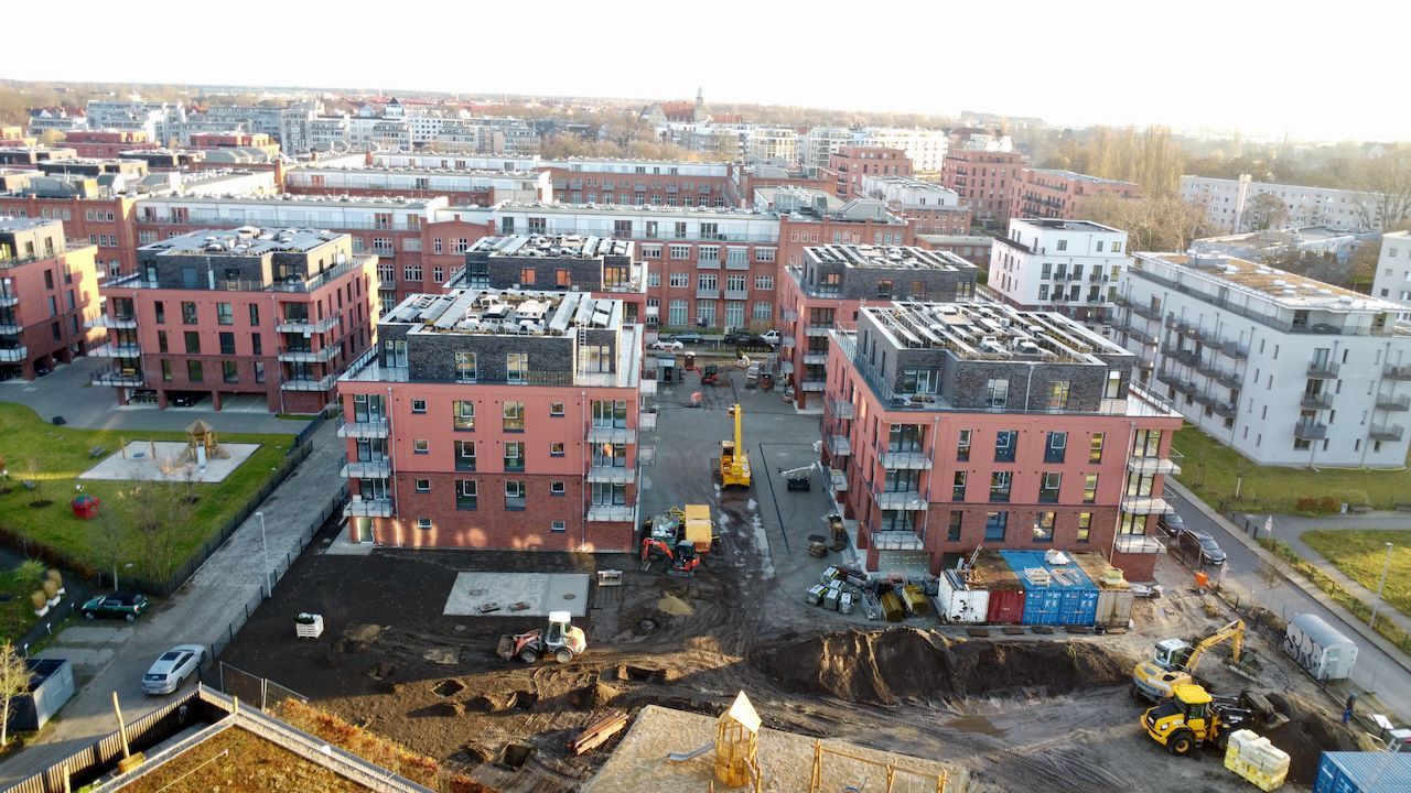 Der November zeigt sich von seiner sonnigen Seite und wirft warmes Licht auf die fortschreitenden Arbeiten im Spreequartier Spindlersfeld. Die Photovoltaik-Anlage auf dem Dachglänzt in der Herbstsonne und wird den späteren Nutzern nachhaltige Energie liefern.